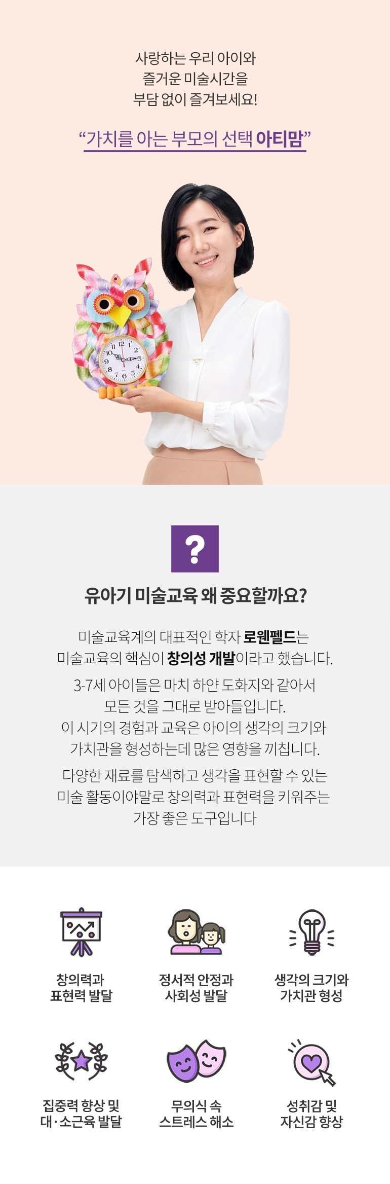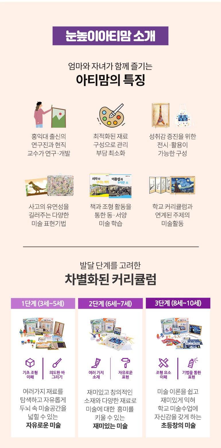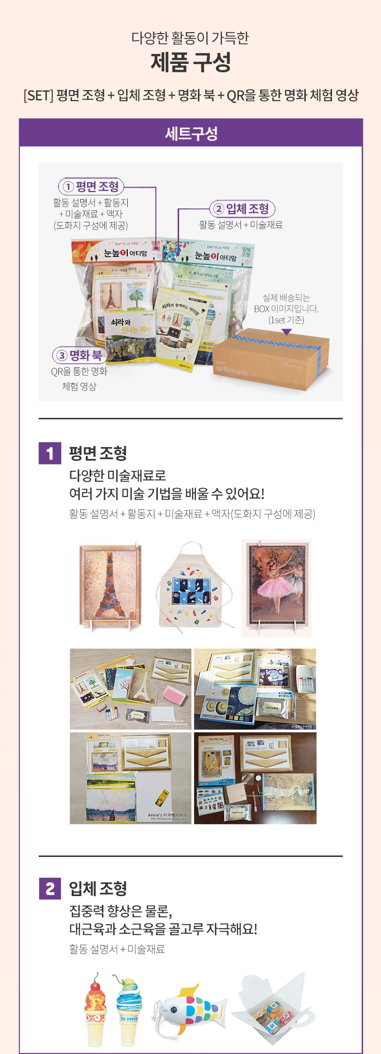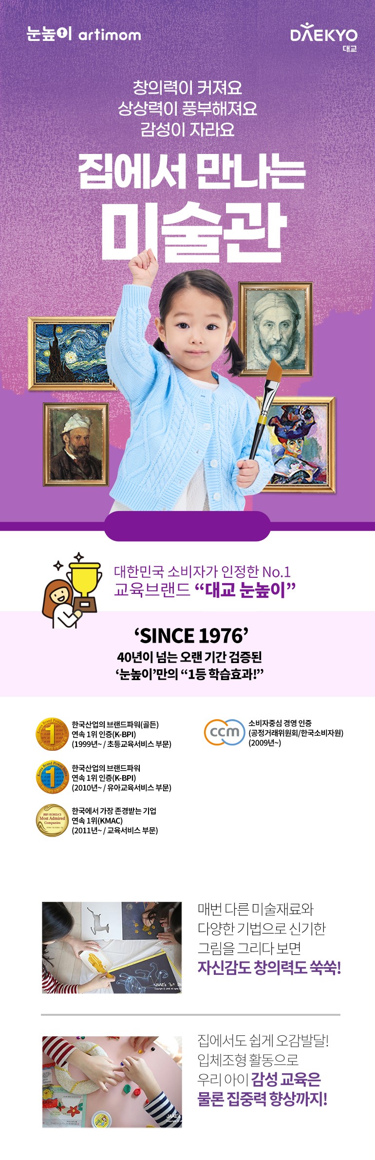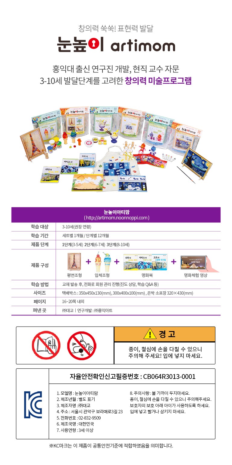 | 품명 및 모델명 | 눈높이 아티맘 미술교육 프로그램 | KC 인증정보 | CB064R3013-0001A(명화북), CB115J0001-8002(펑면조형), CB065H0034-1008/CB063H024-0006(입체조형) |