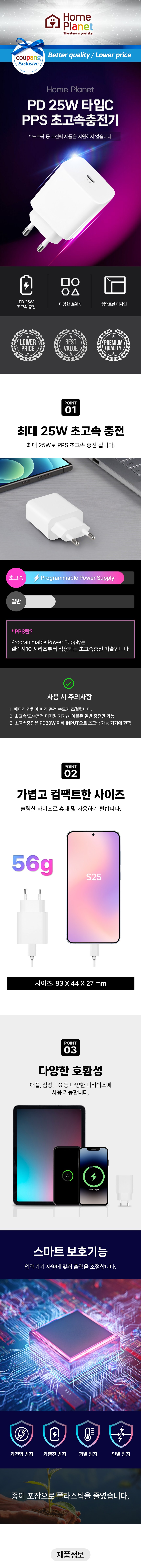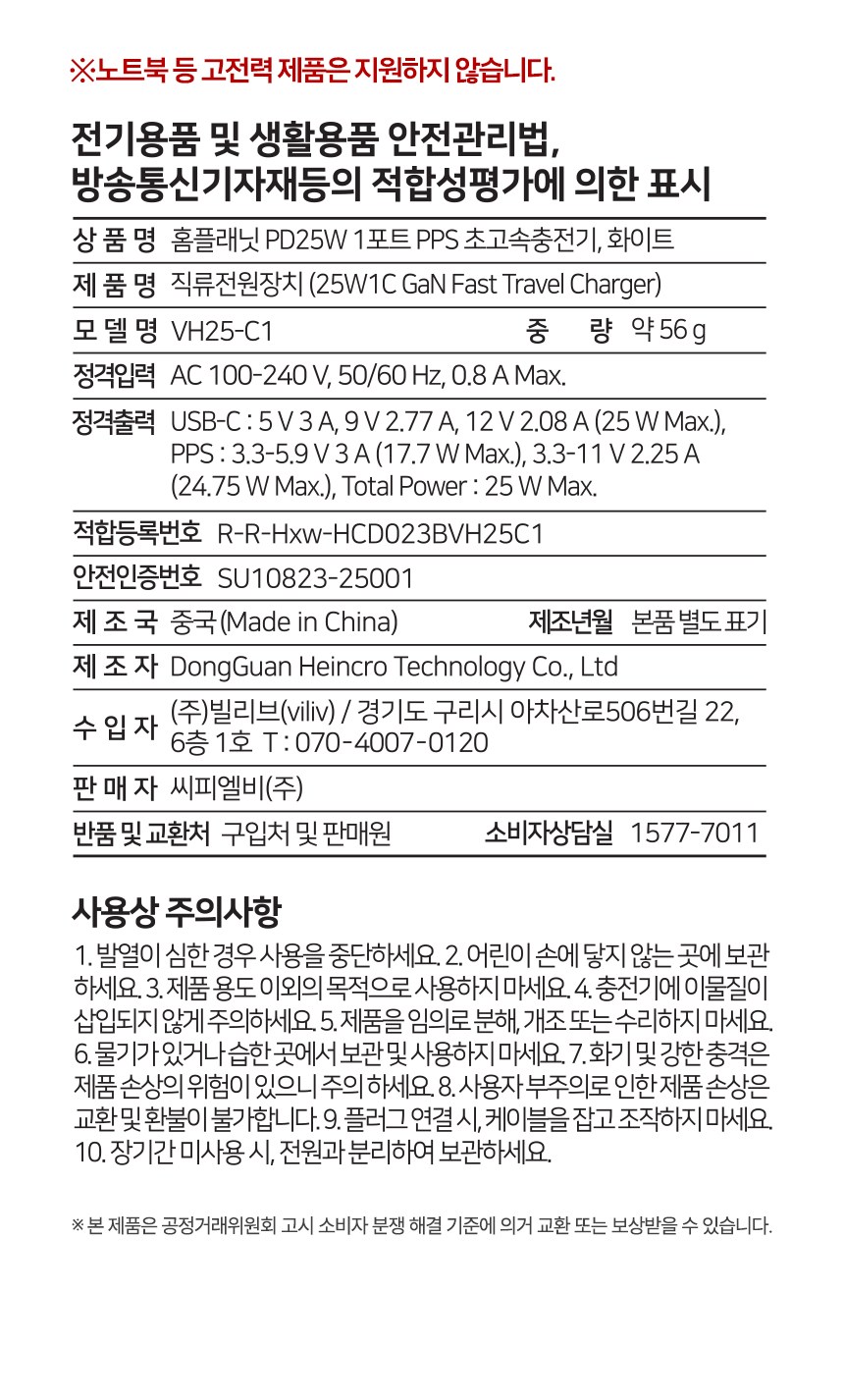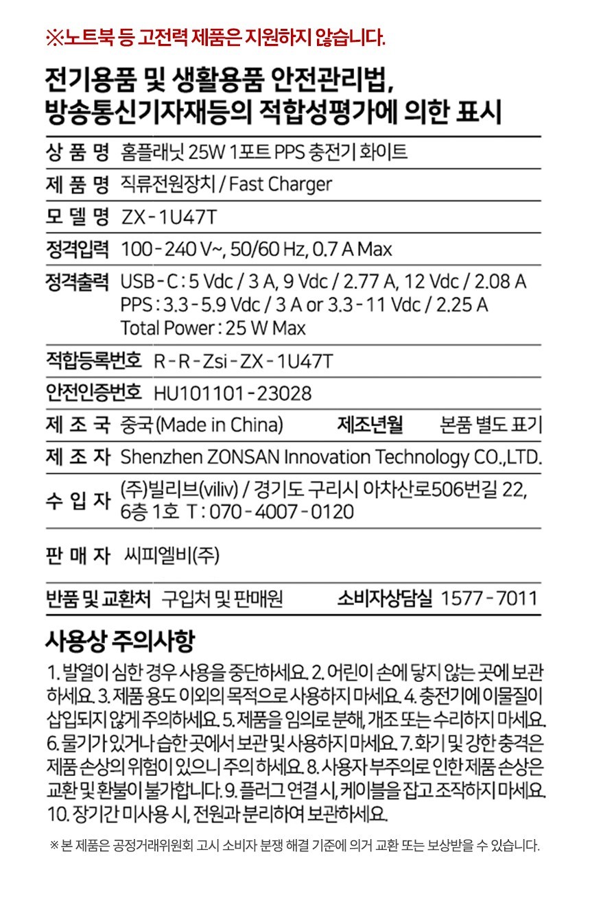| 품명 및 모델명 | 홈플래닛 25W 1포트 PPS 충전기 화이트 / ZX-1U47T 홈플래닛 25W 1포트 PPS 충전기 화이트 / VH25-C1 | KC 인증정보 | 안전인증번호 : HU101101-23028A 적합등록번호 : R-R-Zsi-ZX-1U47T 안전인증번호 : SU10823-25001 적합등록번호: R-R-Hxw-HCD023BVH25C1 |
