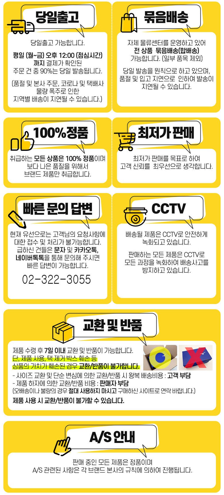 - ㆍ모니터 해상도의 차이로 인해 색상이나 이미지가 실제와 달라, 고객이 단순 변심으로 교환/반품을 무료로 요청하는 경우