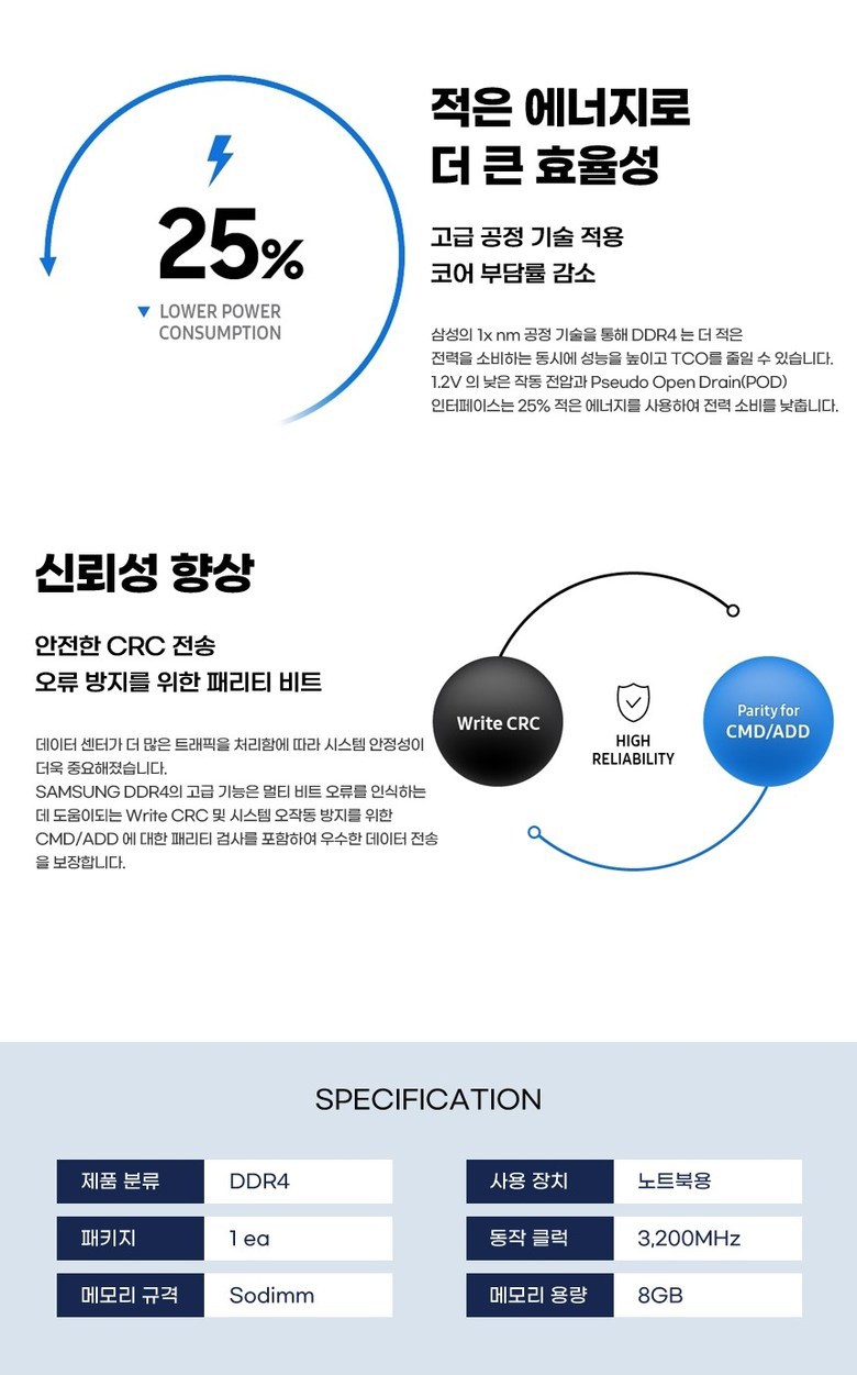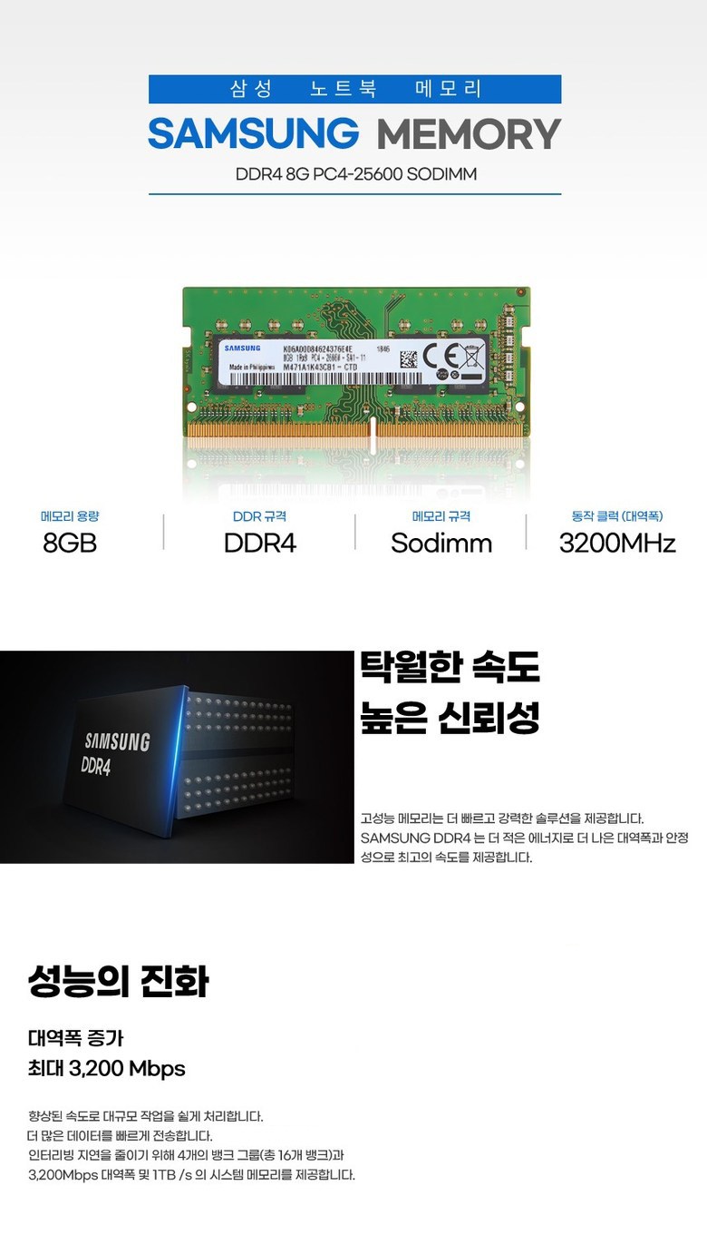 | 품명 및 모델명 | 삼성 DDR4 25600 RAM 8GB 3200Mhz 노트북 메모리 | 인증/허가 사항 | 해당 없음 |