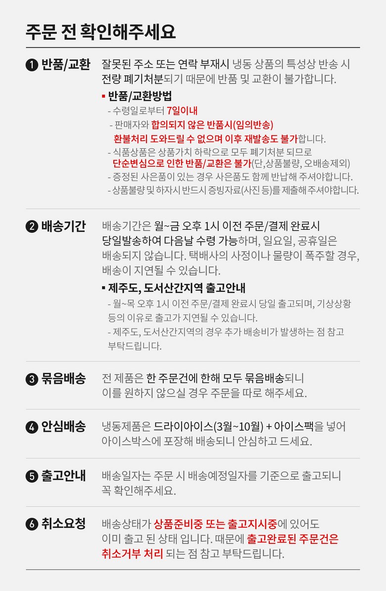 | 교환/반품 비용 (왕복비용) | 6,000원 - 단, 고객 변심의 경우에만 발생 - 도서산간 및 일부 지역 추가비용 발생 - 부분반품 시, 남은금액이 무료배송 조건을 유지하면 편도 배송비용만 부과 |