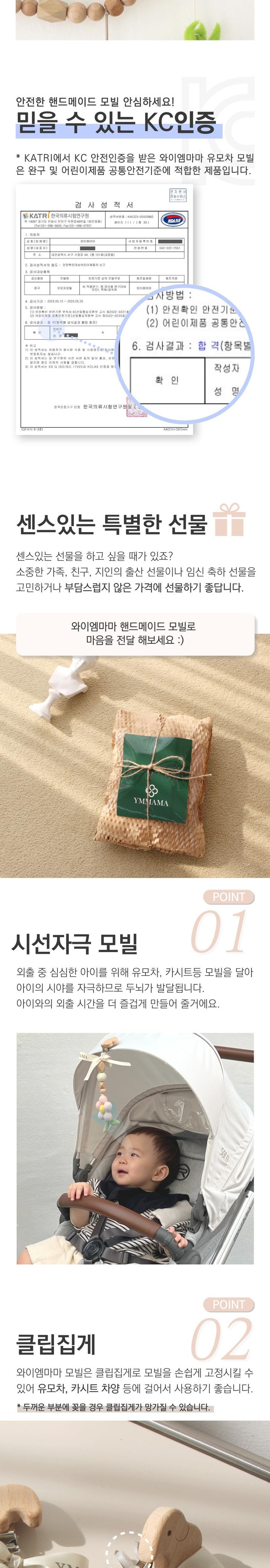 | 품명 및 모델명 | 와이엠마마 핸드메이드 모빌 | KC 인증정보 | 안전확인 인증 - 한국의류시험연구원 CB064F018-3001 |