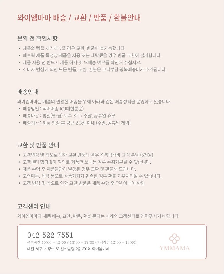 - ㆍ모니터 해상도의 차이로 인해 색상이나 이미지가 실제와 달라, 고객이 단순 변심으로 교환/반품을 무료로 요청하는 경우