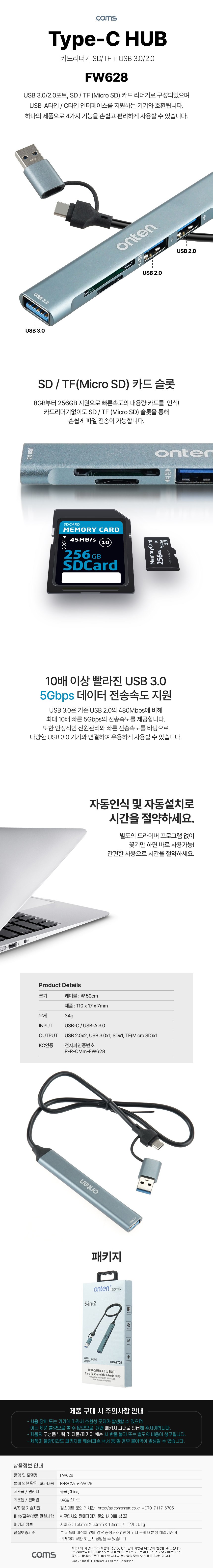 | 품명 및 모델명 | USB Type C, Type A 카드리더+허브 / FW628 | KC 인증정보 | R-R-CMm-FW628 |