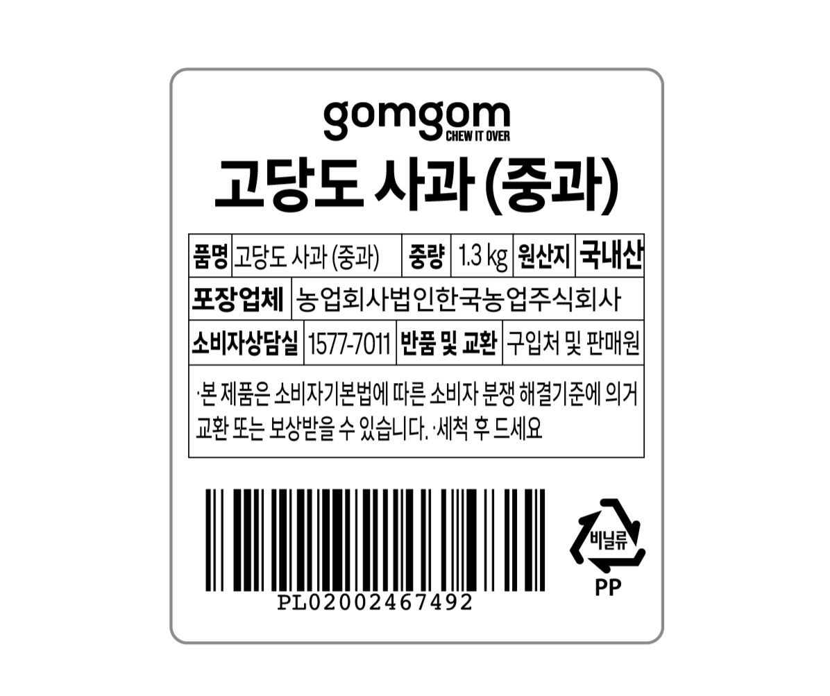 | 품목 또는 명칭 | 고당도 사과 중과 | 포장단위별 내용물의 용량(중량),수량,크기 | 1.3kg, 1개 |