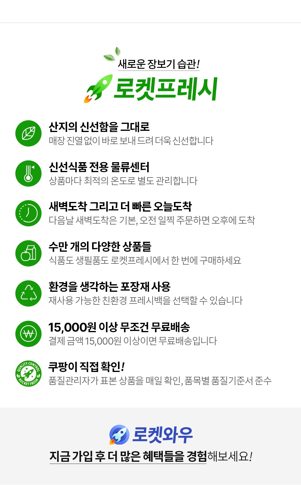 | 배송방법 | 신선/냉장/냉동 | 배송비 | 무료배송 - 로켓프레시 상품 중 15,000원 이상 구매 시 무료배송 - 해당 서비스 가능 지역에 한함 |